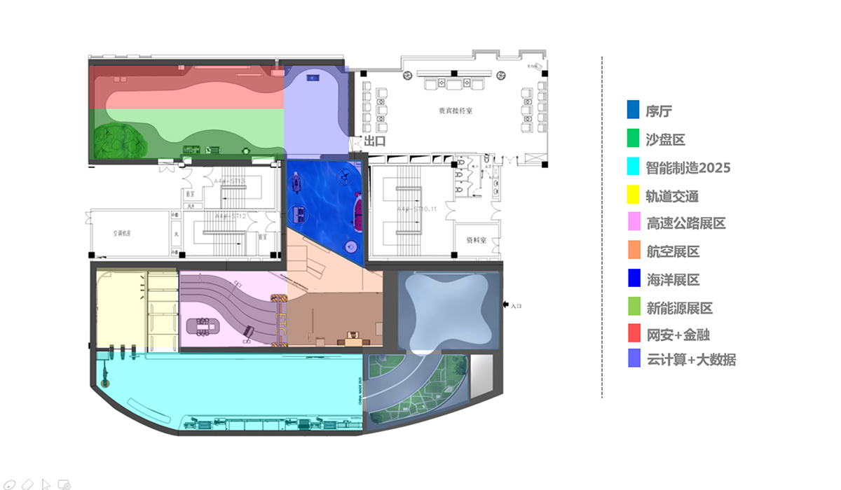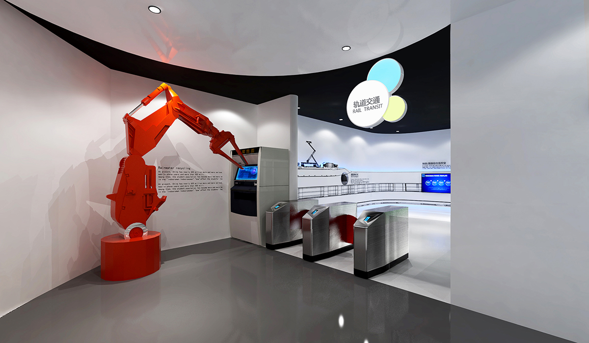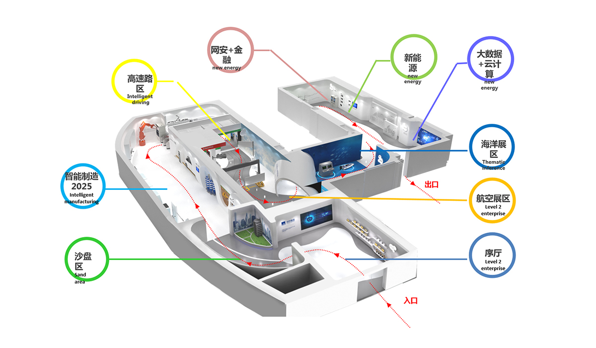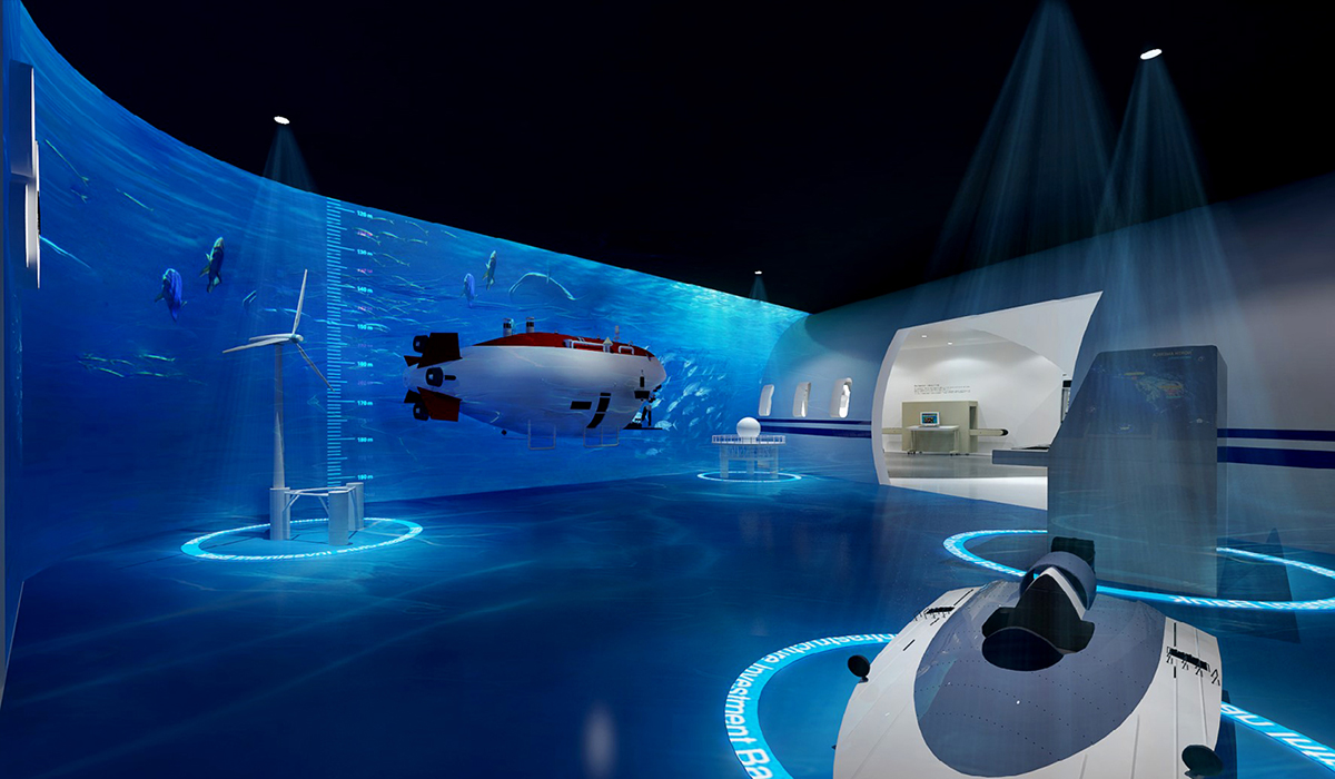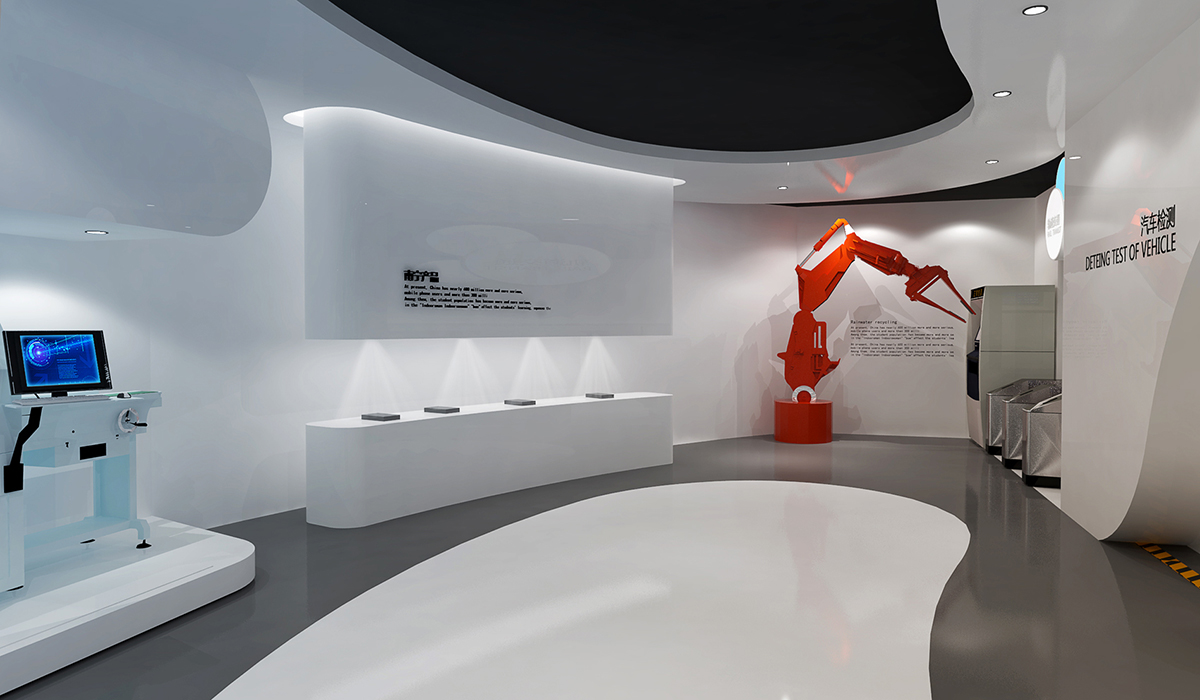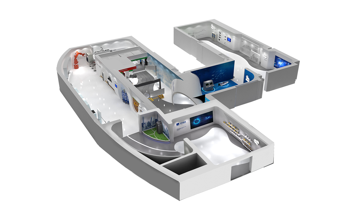 我們在深入梳理企業核心技術優勢,以及未來產業規劃的基礎上,采用流線型動線造型設計,將理性、生硬的技術,通過靈動的空間與有趣的數字體驗技術相融合。創造出不同的體驗場景設計,讓參觀者在不知不覺的參觀體驗過程中,將產品融合到陸、海、空的交通設備中,完成了一種新奇的體驗這旅。