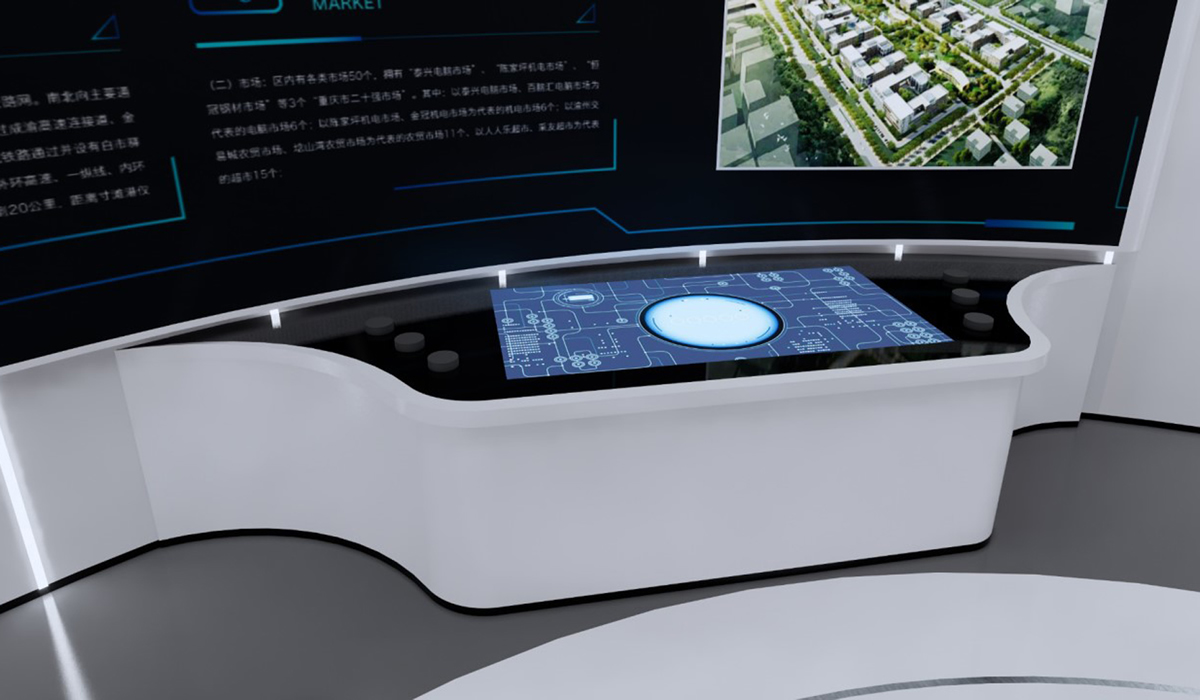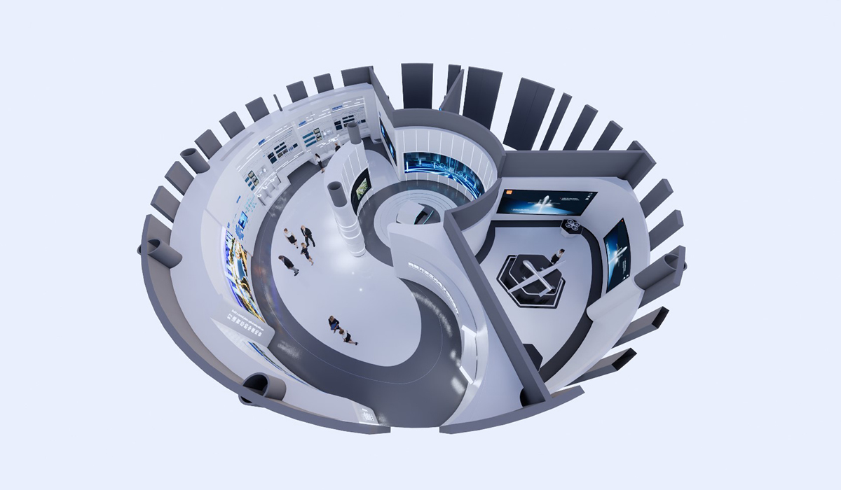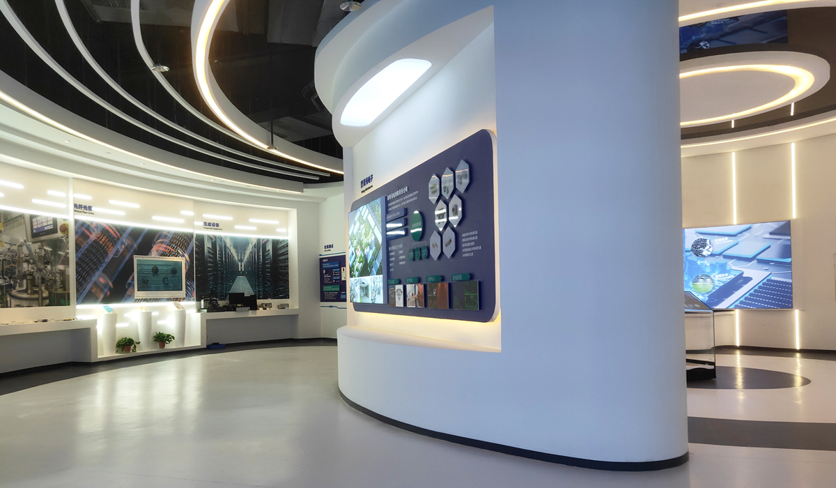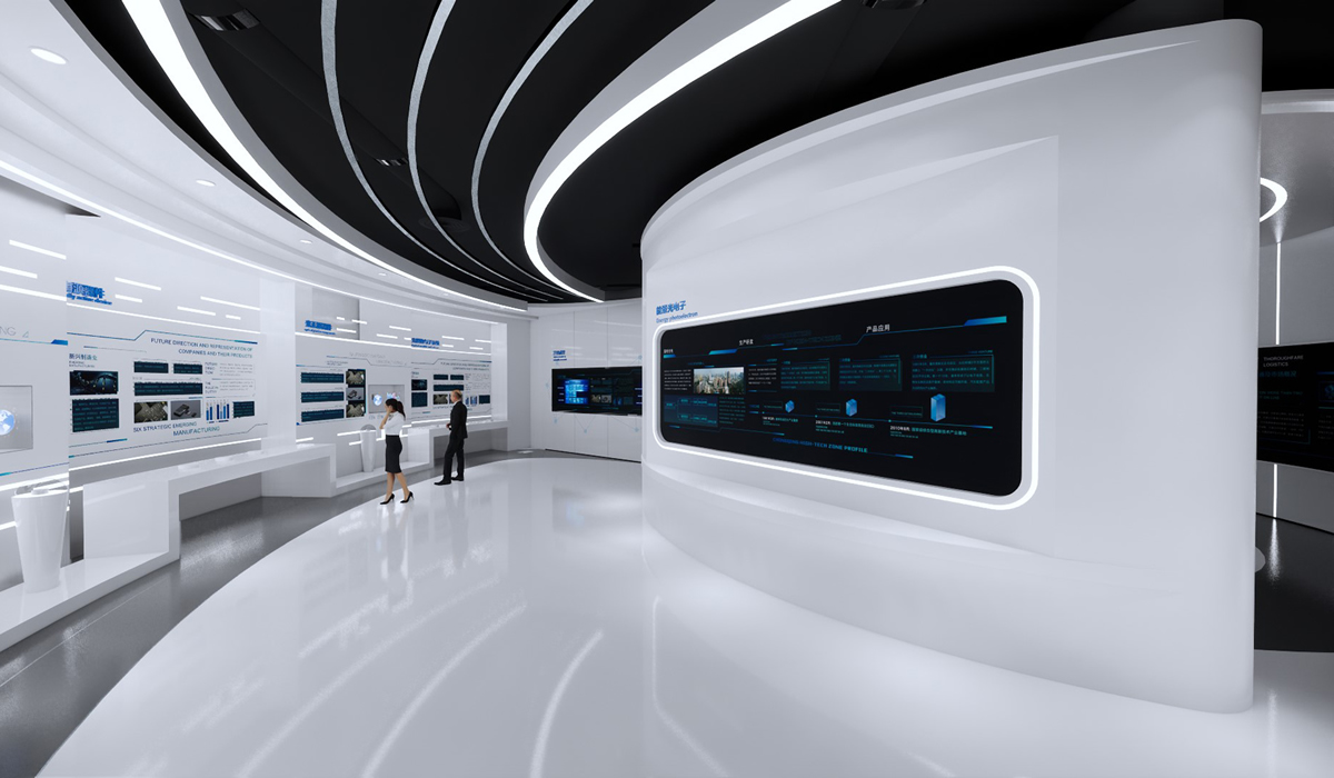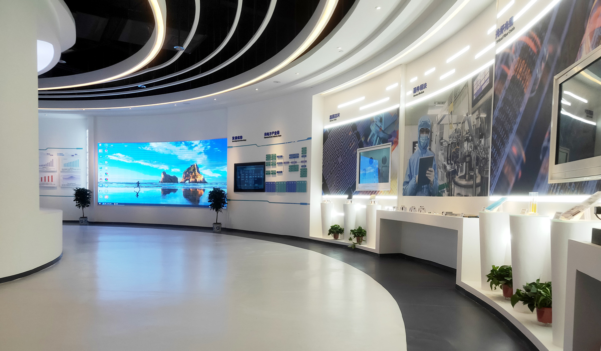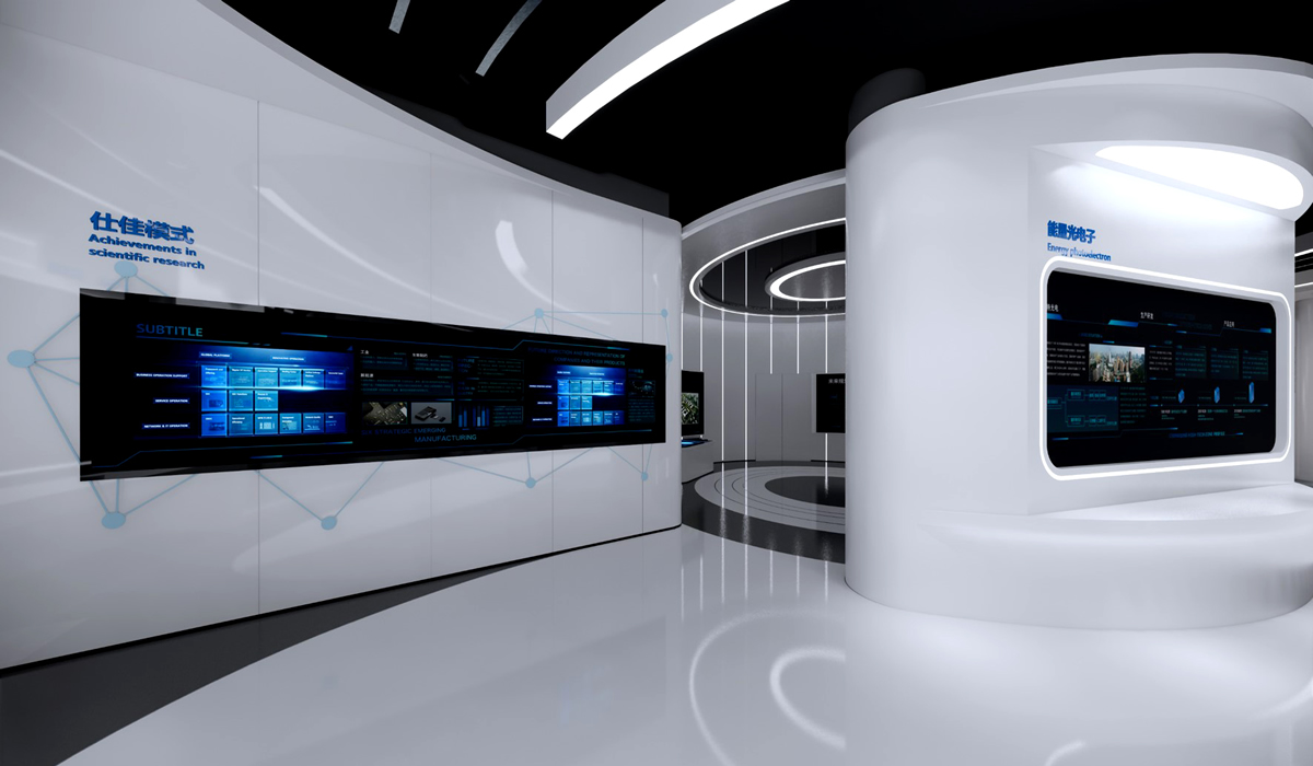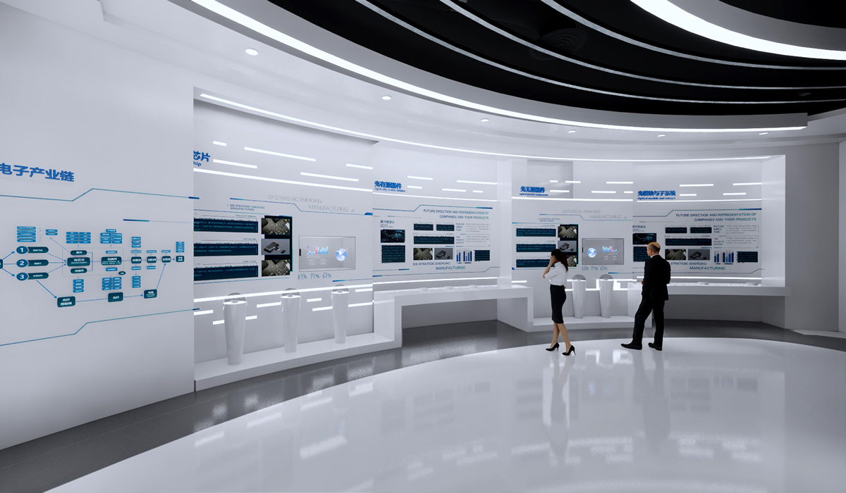 從產業優勢開始,從技術能力、園區現狀、資源、產品應用前景,以及政府對于產業支持的態度幾個維度著手,在空間的設計中快速找到產業特性符號流動的故事敘述風格及手段。充分體現行業找到內容信息之間的邏輯關系,讓信息在這空間如講故事一般去逐漸闡述行業現狀以及未來發展前景。在這一過程中充分運用多媒體展示技術的特種,融入視頻、互動體驗、趣味數字互動,讓觀者深入其中,增加對未來產業發展的信心。